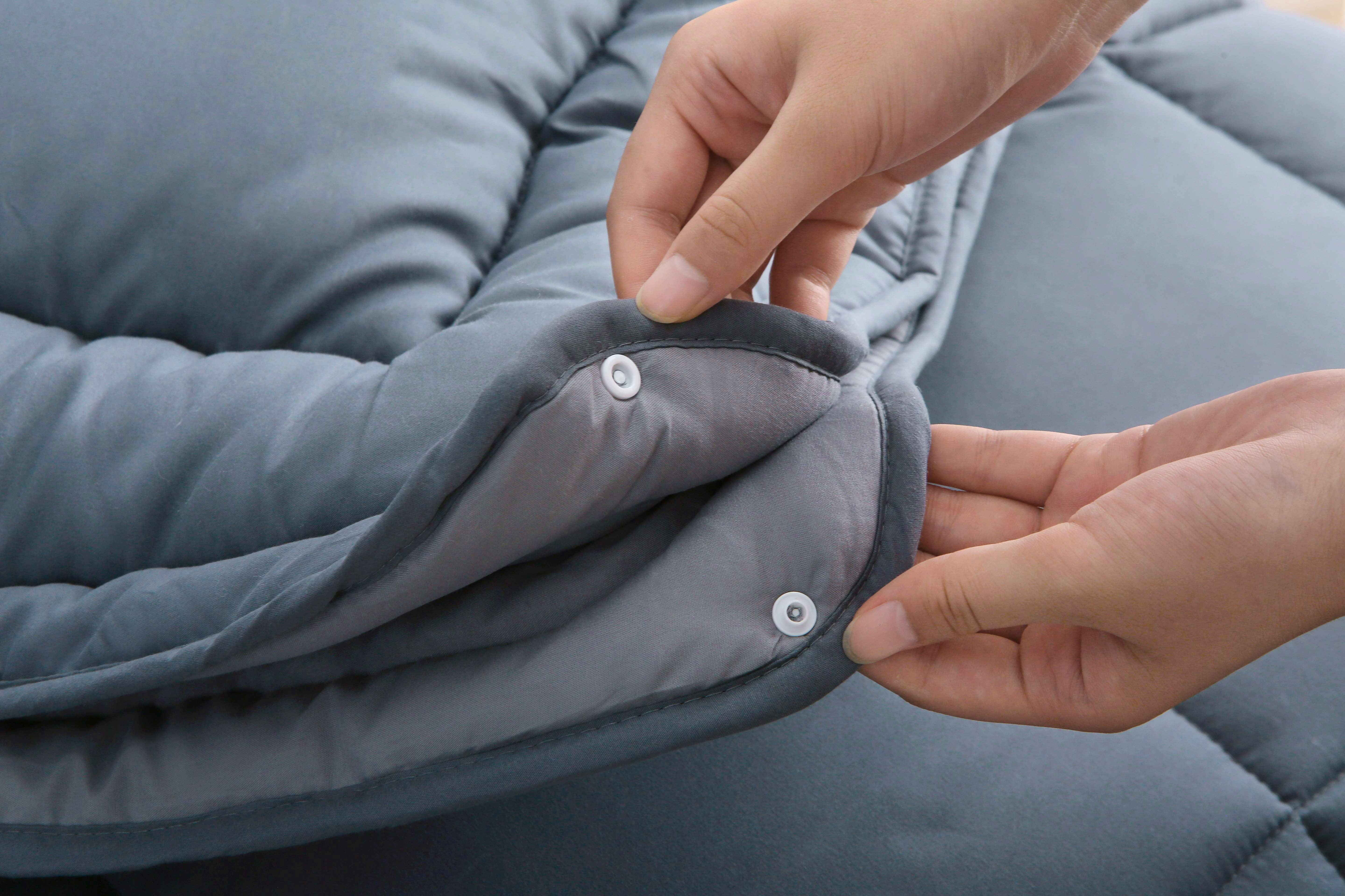 Het dekbed bestaat uit twee losse delen: een zomerdeel van 200 g/m² en een warmer deel van 400 g/m². Via stevige drukknopen kunnen de lagen eenvoudig aan elkaar worden bevestigd voor extra warmte in de winter. In de lente en zomer gebruikt u alleen het lichtere deel.