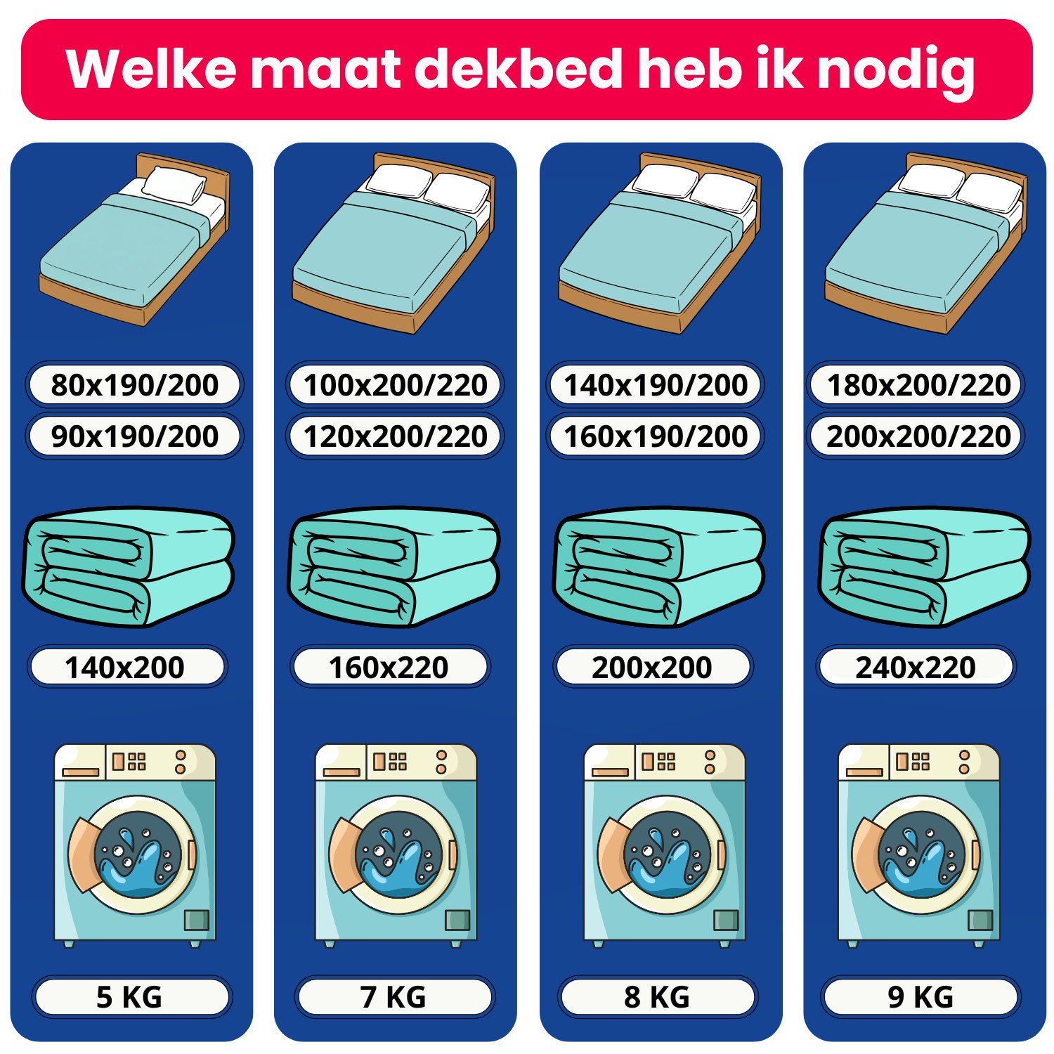 Om het dekbed te kunnen wassen in de wasmachine heeft uw wasmachine een minimaal laadvermogen nodig. Het minimale laadvermogen is afhankelijk van de afmeting van het dekbed dat u wilt wassen. Zie hiervoor het onderstaande lijstje.