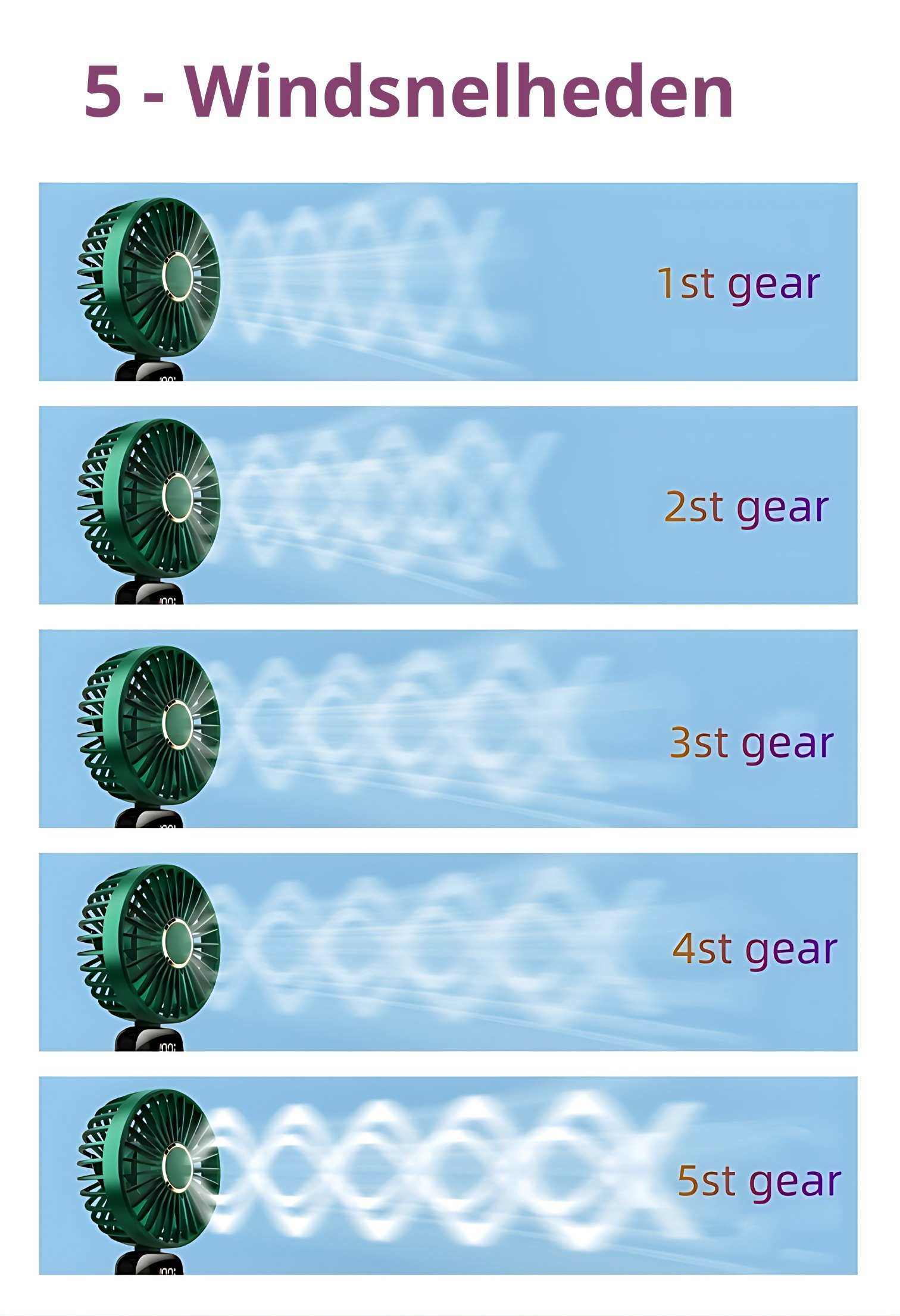 - Wind Snelheden: Kies uit 5 instelbare windsnelheden voor de perfecte verkoeling op maat.