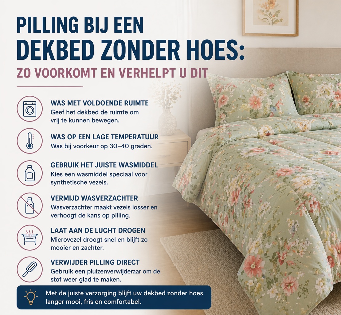 Een dekbed zonder overtrek is praktisch, hygiënisch en comfortabel. Toch krijgen sommige gebruikers na verloop van tijd te maken met pilling: kleine bolletjes op de stof die het dekbed er minder mooi uit laten zien. In dit artikel leest u hoe pilling ontstaat, hoe u het kunt voorkomen en wat u kunt doen als het toch optreedt.